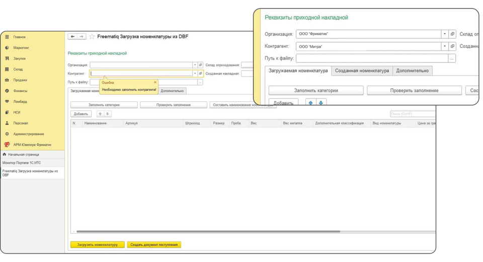 Для создания номенклатуры пользователь выбирает организацию и поставщика, от которого пришёл товар. При незаполненных полях пользователь получит сообщение с указанием, что необходимо исправить.